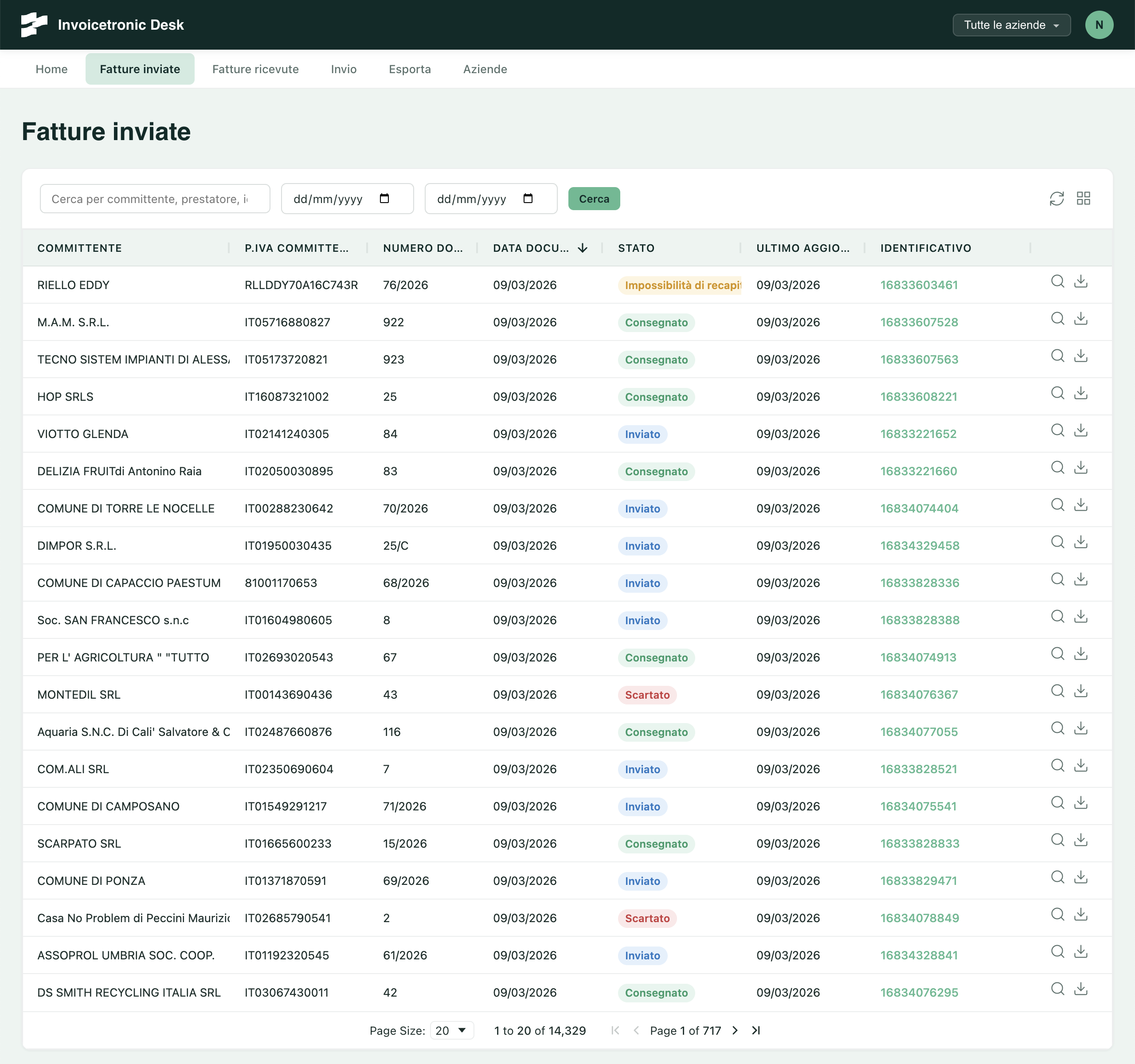 - Invio e ricezione fatture — ricerca full-text, filtri per data, paginazione server-side, download XML